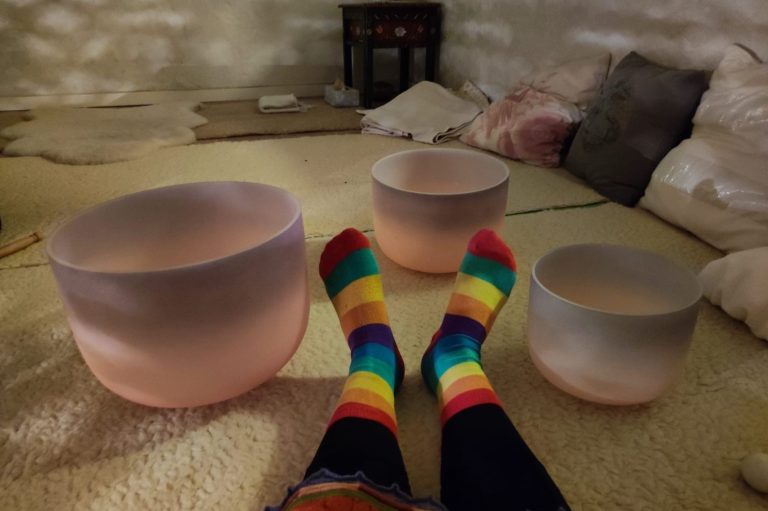 Das können verschiedene Klangschalen sein, Trommeln oder ( geminsames ) chanten. Das besprechen wir entweder vorher oder entscheiden es spontan in der Behandlung.